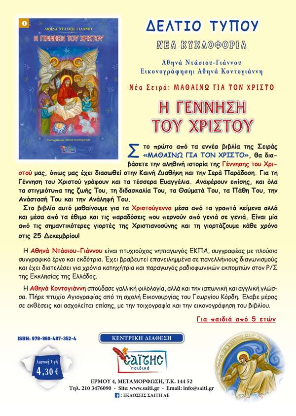Μόλις έφτασε στα χέρια μου η νέα πολύ προσεγμένη μου δουλειά σε συνεργασία με τις εκδόσεις της Αποστολικής Διακονίας. Το κείμενο πολύ κοντά στα μικρά μας παιδιά, με ζωγραφιές έτοιμες να τις χρωματίσουν στις τελευταίες σελίδες και πολύ καλή δουλειά στην εικονογράφηση από την Αθηνά Κοντογιάννη.